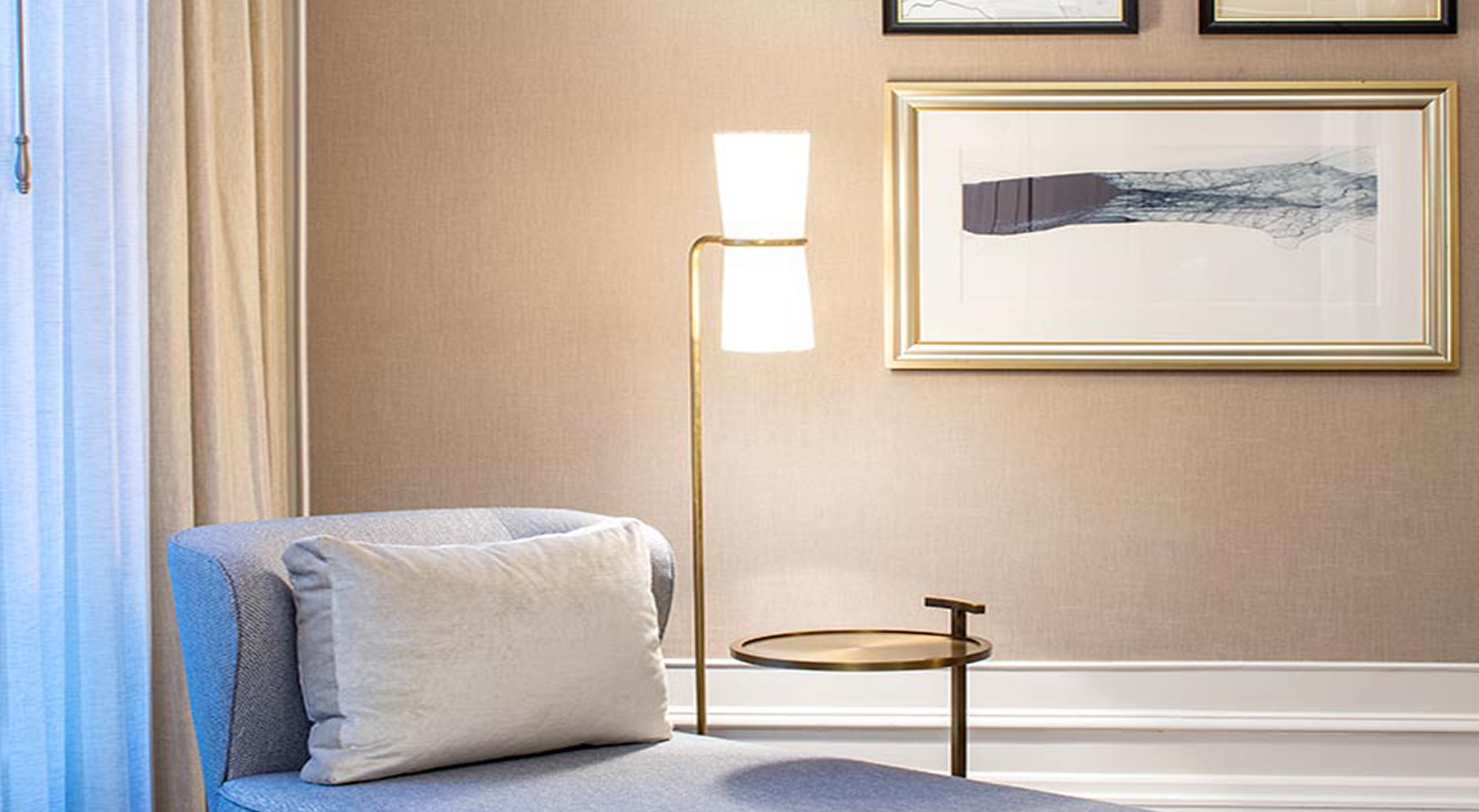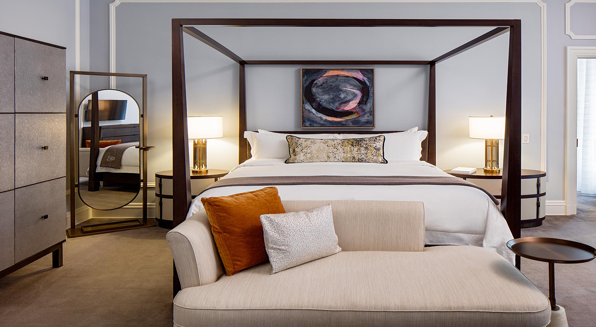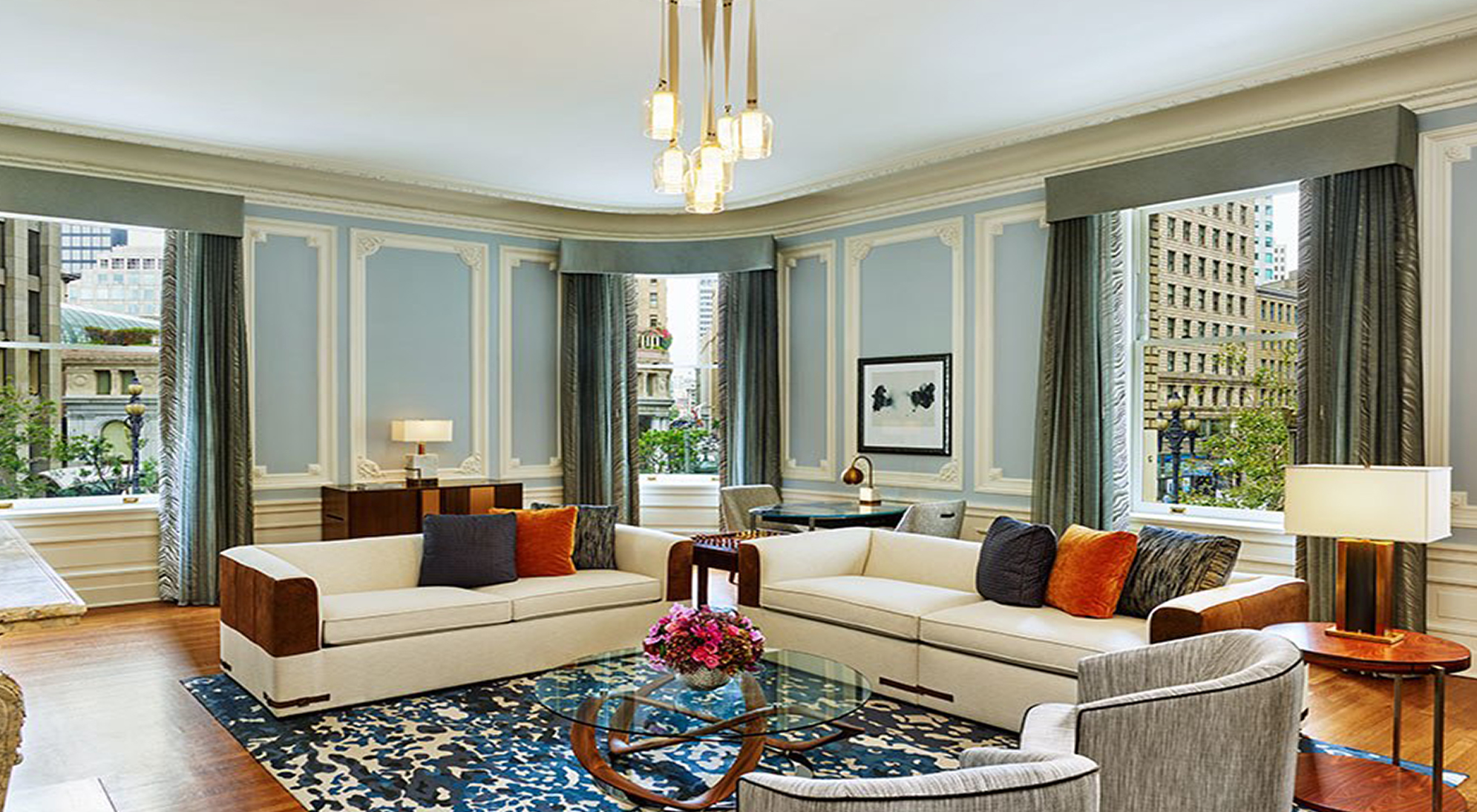 The 553 guest rooms were given a soft, serene palette. Leather headboards, dark wood accents, metallic surfaces expressed in lighting, and marble baths lend a contemporary feel. In the suites, new clean-lined furnishings in a tranquil palette of cream and dove-gray are the perfect backdrop for pops of orange, shimmering draperies, and richly finished lighting in bronze tones, glass and cream leather.